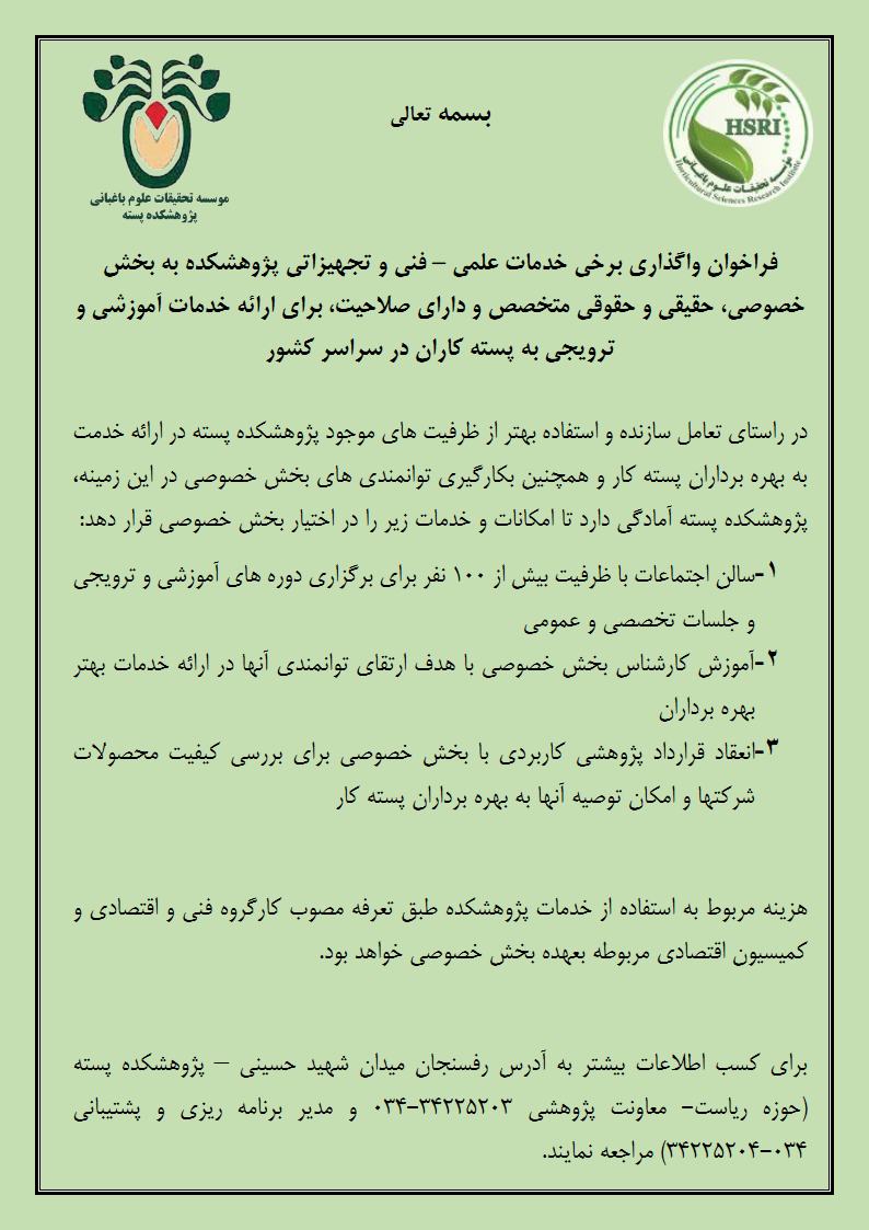 فراخوان واگذاري برخي خدمات علمي – فني و تجهيزاتي پژوهشكده به بخش خصوصي، حقيقي و حقوقي متخصص و داراي صلاحيت، براي ارائه خدمات آموزشي و ترويجي به پسته كاران در سراسر كشور